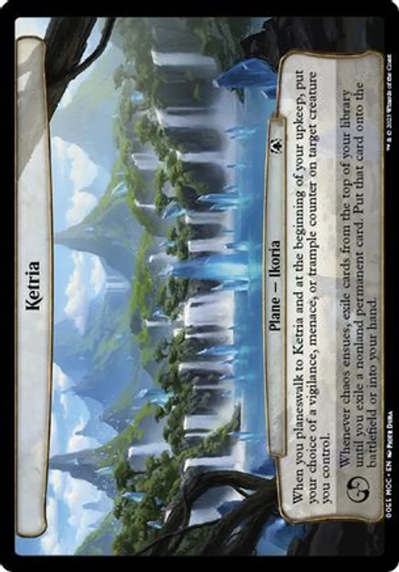 | Oracle Text | When you planeswalk to Ketria and at the beginning of your upkeep, put your choice of vigilance, menace, or trample counter on target creature you control.