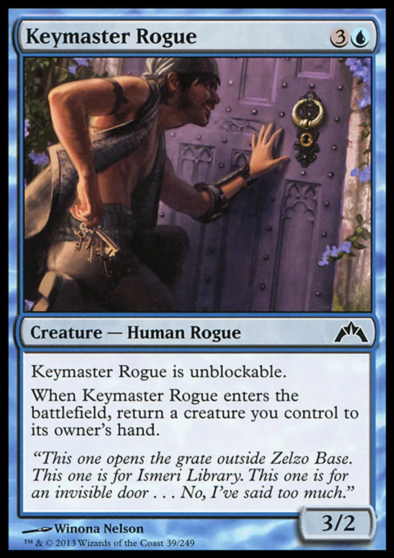 | Oracle Text | Keymaster Rogue is unblockable. When Keymaster Rogue enters the battlefield, return a creature you control to its owner's hand. | ||