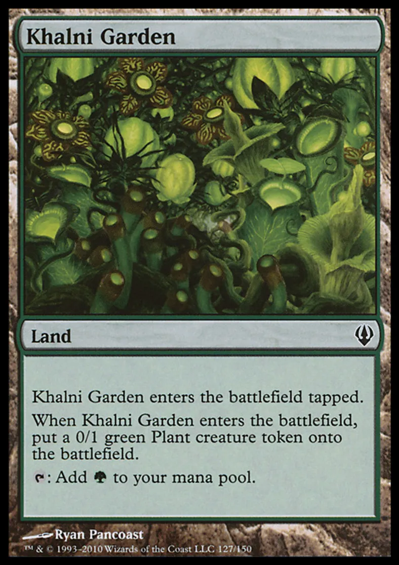 | Oracle Text | Khalni Garden enters the battlefield tapped. When Khalni Garden enters the battlefield, put a 0/1 green Plant creature token onto the battlefield. {{t}}: Add {{g}} to your mana pool. | ||