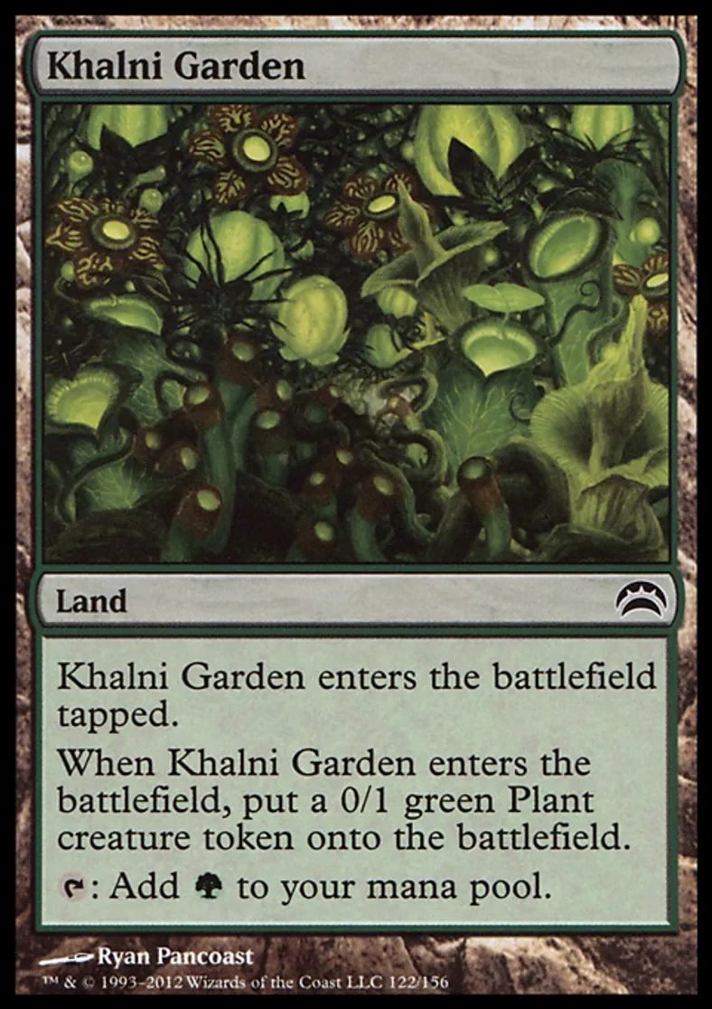 | Oracle Text | Khalni Garden enters the battlefield tapped. When Khalni Garden enters the battlefield, put a 0/1 green Plant creature token onto the battlefield. {{t}}: Add {{g}} to your mana pool. | ||