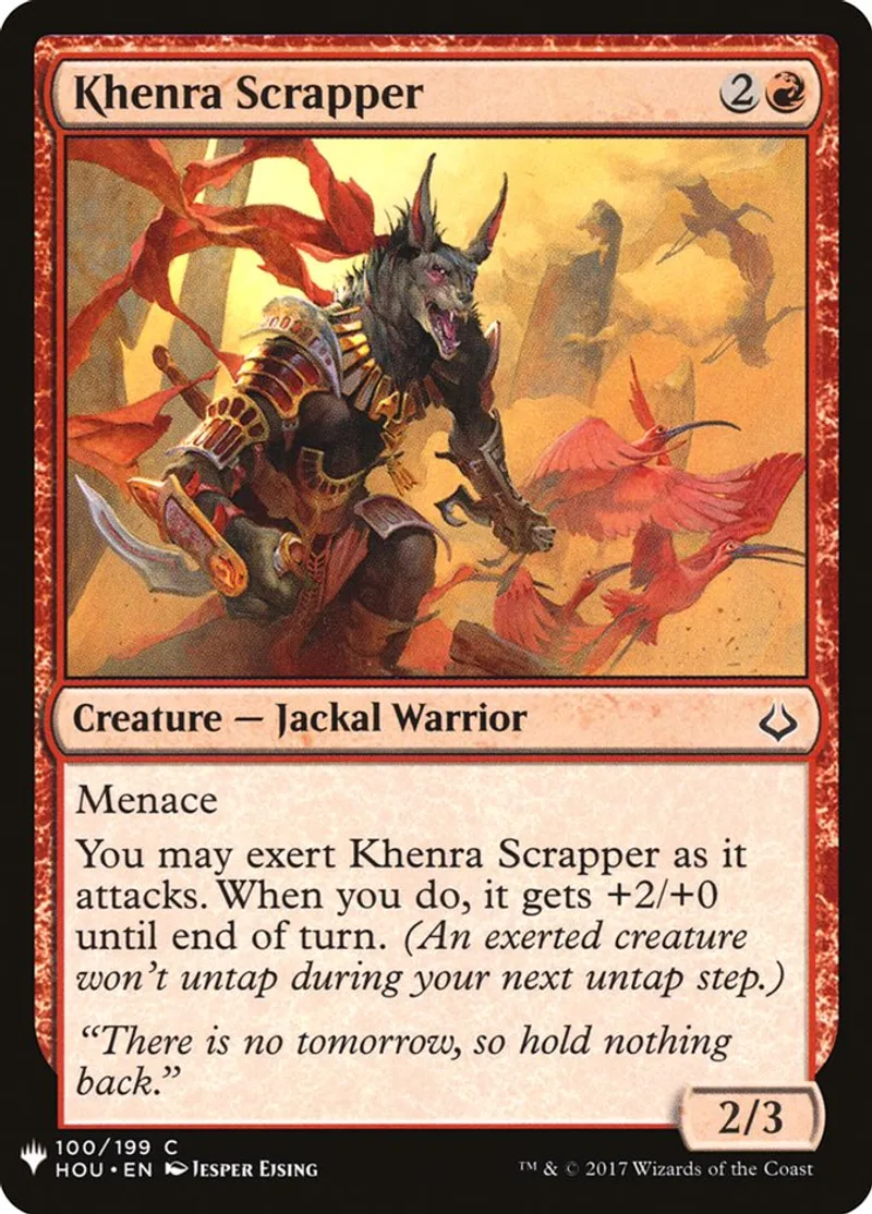 You may exert Khenra Scrapper as it attacks. When you do, it gets +2/+0 until end of turn. (An exerted creature won't untap during your next untap step.) | ||