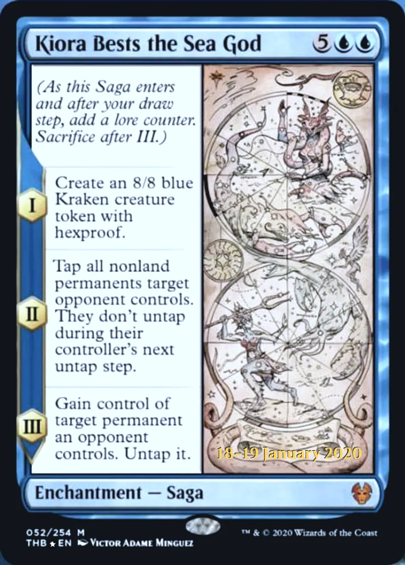 | Oracle Text | (As this Saga enters and after your draw step, add a lore counter. Sacrifice after III.)\r\nI — Create an 8/8 blue Kraken creature token with hexproof.\r\nII — Tap all nonland permanents target opponent controls. They don\'t untap during their controller\'s next untap step.\r\nIII — Gain control of target permanent an opponent controls. Untap it. | ||
