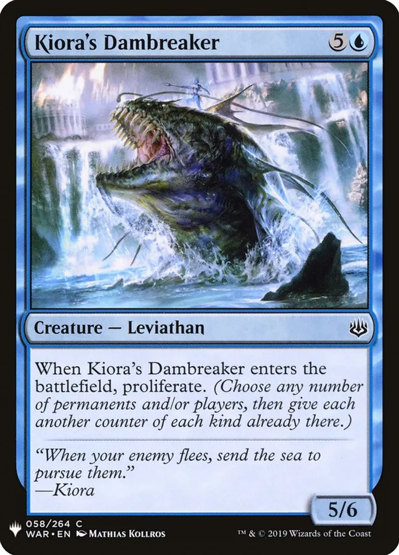 | Oracle Text | When Kiora's Dambreaker enters the battlefield, proliferate. (Choose any number of permanents and/or players, then give each another counter of each kind already there.) | ||