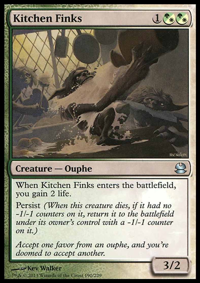 | Oracle Text | When Kitchen Finks enters the battlefield, you gain 2 life. Persist (When this creature dies, if it had no -1/-1 counters on it, return it to the battlefield under its owner's control with a -1/-1 counter on it.) | ||