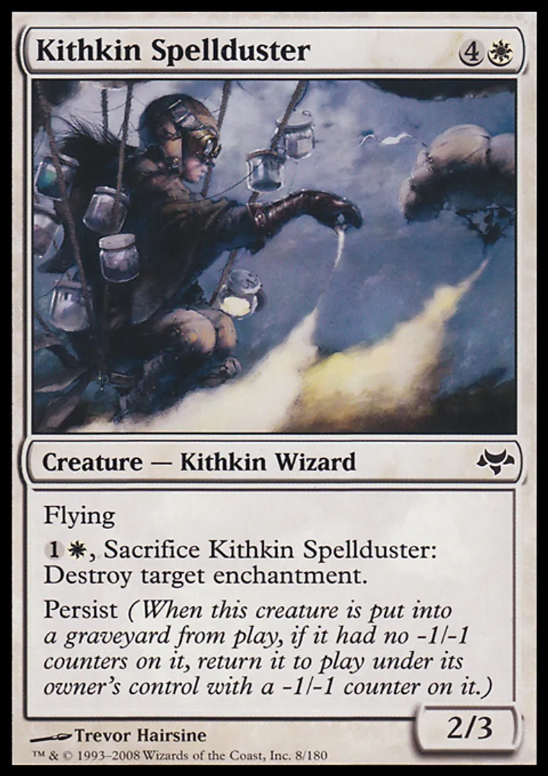 | Oracle Text | Flying {{1}}{{w}}, Sacrifice Kithkin Spellduster: Destroy target enchantment. Persist (When this creature dies, if it had no -1/-1 counters on it, return it to the battlefield under its owner's control with a -1/-1 counter on it.) | ||