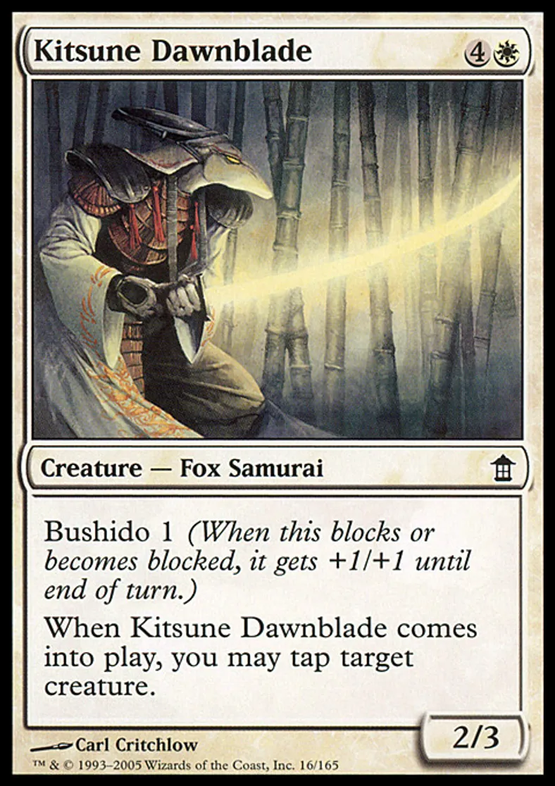 | Oracle Text | Bushido 1 (When this blocks or becomes blocked, it gets +1/+1 until end of turn.) When Kitsune Dawnblade enters the battlefield, you may tap target creature. | ||