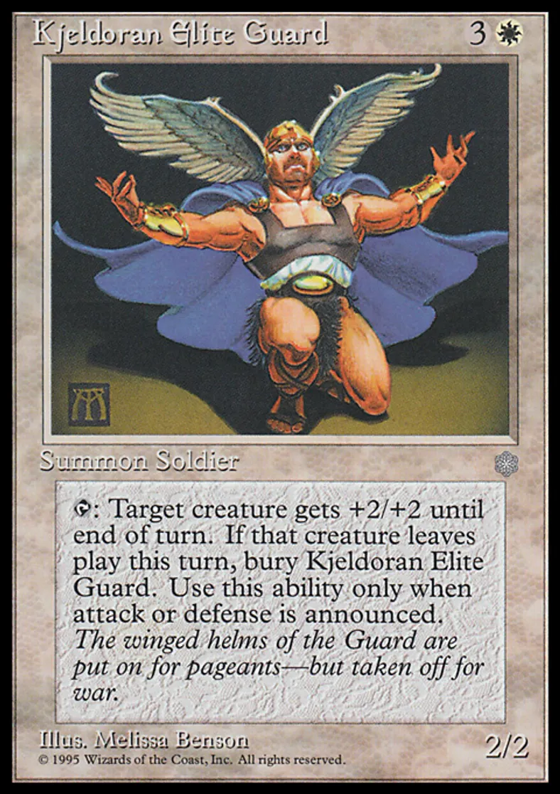 | Oracle Text | {{t}}: Target creature gets +2/+2 until end of turn. When that creature leaves the battlefield this turn, sacrifice Kjeldoran Elite Guard. Activate this ability only during combat. | ||
