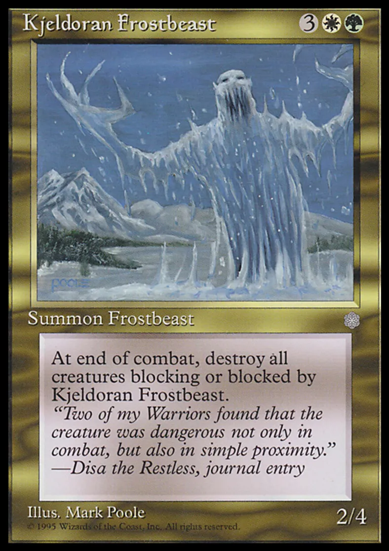 | Oracle Text | At end of combat, destroy all creatures blocking or blocked by Kjeldoran Frostbeast. | ||
