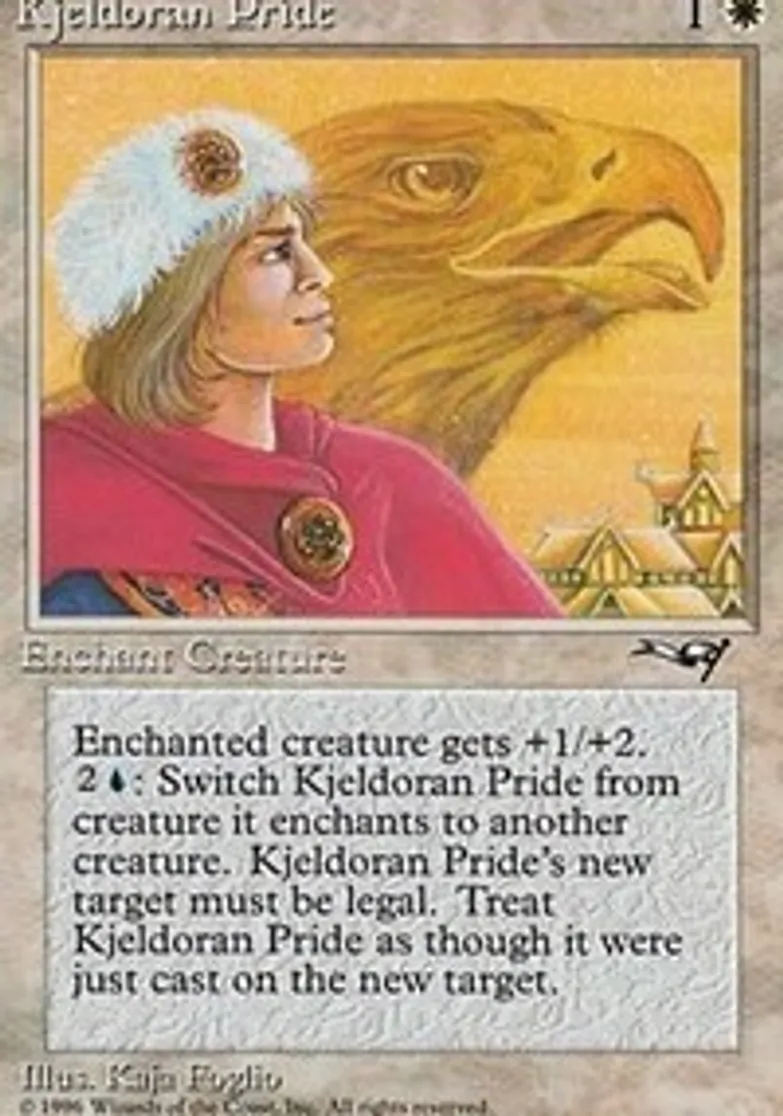 | Oracle Text | Enchanted creature gets +1/+2.2{{u}}: Switch Kjeldoran Pride from creature it enchants to another creature. Kjeldoran Pride's new target must be legal. Treat Kjeldoran Pride as though it were just cast on the new target. | ||