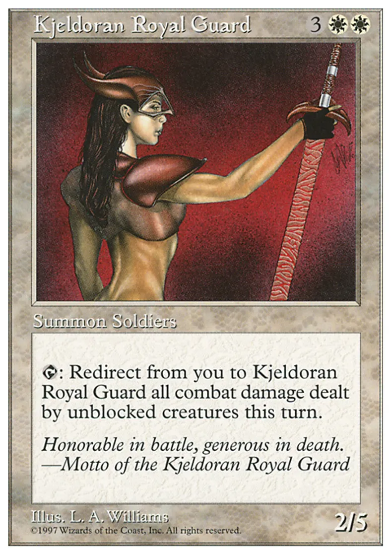 | Oracle Text | {{t}}: All combat damage that would be dealt to you by unblocked creatures this turn is dealt to Kjeldoran Royal Guard instead. | ||