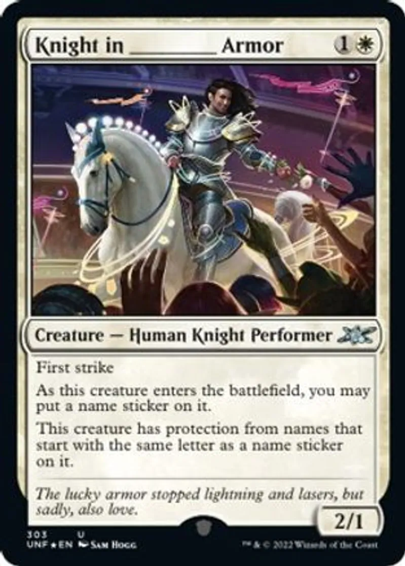 Magic: the Gathering (mtg) Uncommon Creature — Human Knight Performer Knight in _____ Armor from Unfinity (UNF) last updated 2026-02-24 15:39:02