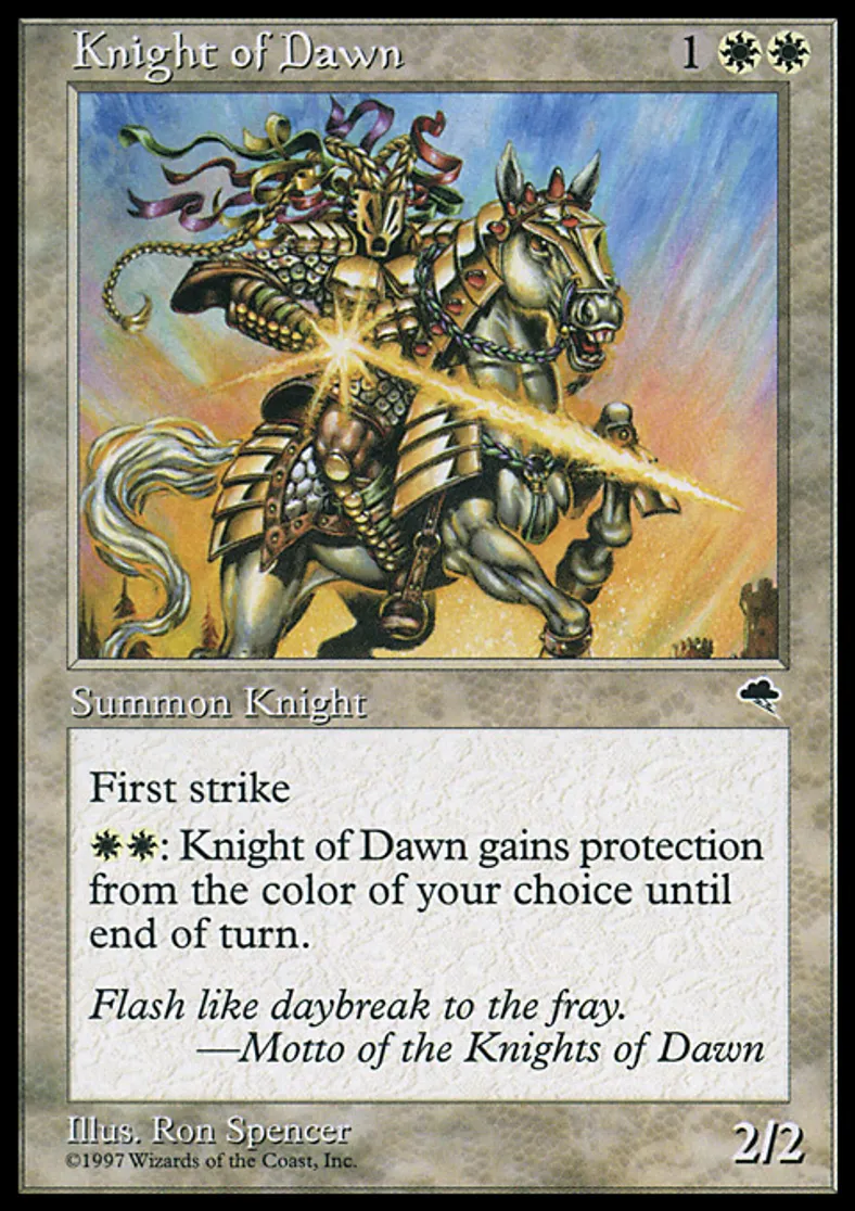 | Oracle Text | First strike {{w}}{{w}}: Knight of Dawn gains protection from the color of your choice until end of turn. | ||