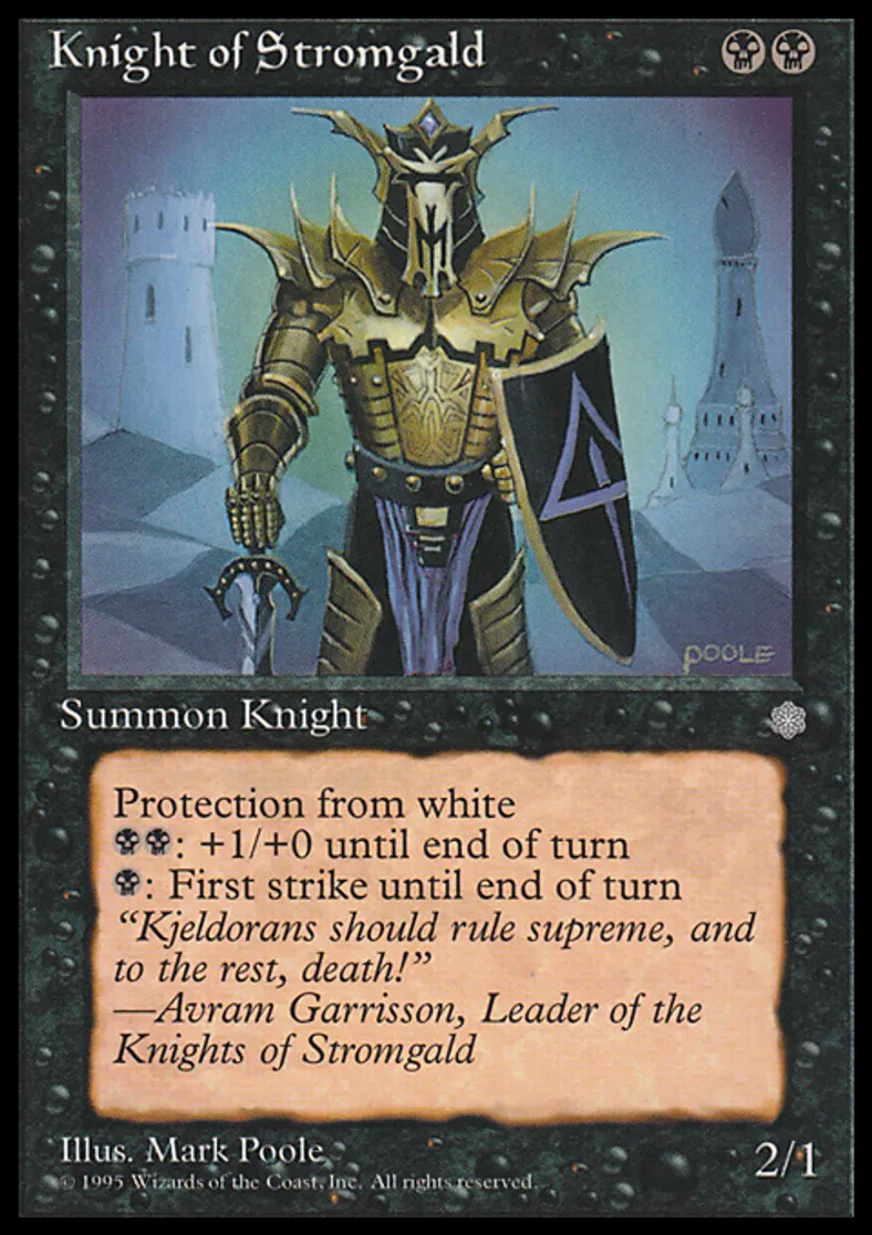 | Oracle Text | Protection from white {{b}}: Knight of Stromgald gains first strike until end of turn. {{b}}{{b}}: Knight of Stromgald gets +1/+0 until end of turn. | ||