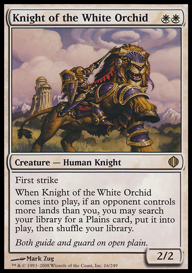 | Oracle Text | First strike When Knight of the White Orchid enters the battlefield, if an opponent controls more lands than you, you may search your library for a Plains card, put it onto the battlefield, then shuffle your library. | ||