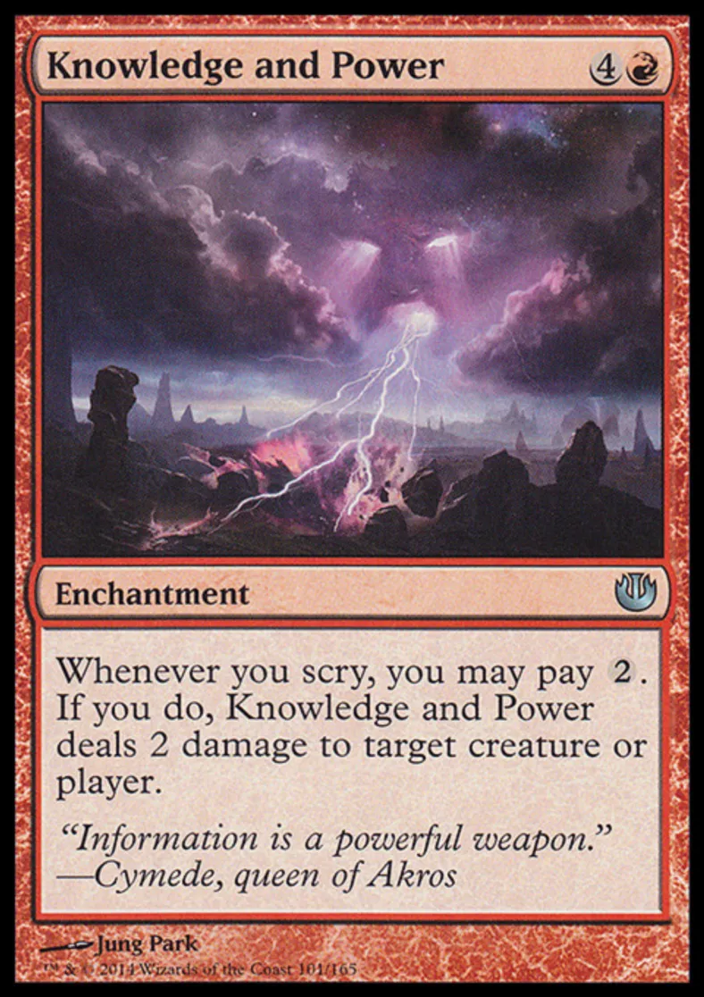 | Oracle Text | Whenever you scry, you may pay {{2}}. If you do, Knowledge and Power deals 2 damage to target creature or player. | ||