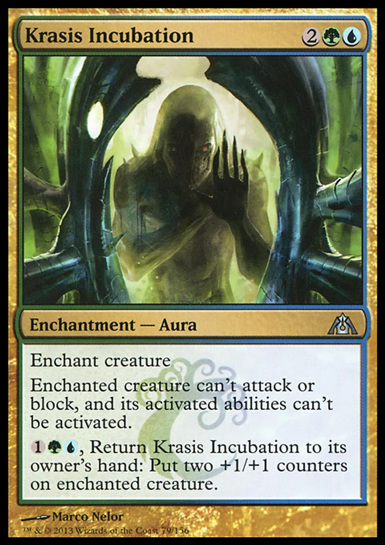 | Oracle Text | Enchant creature Enchanted creature can't attack or block, and its activated abilities can't be activated. {{1}}{{g}}{{u}}, Return Krasis Incubation to its owner's hand: Put two +1/+1 counters on enchanted creature. | ||