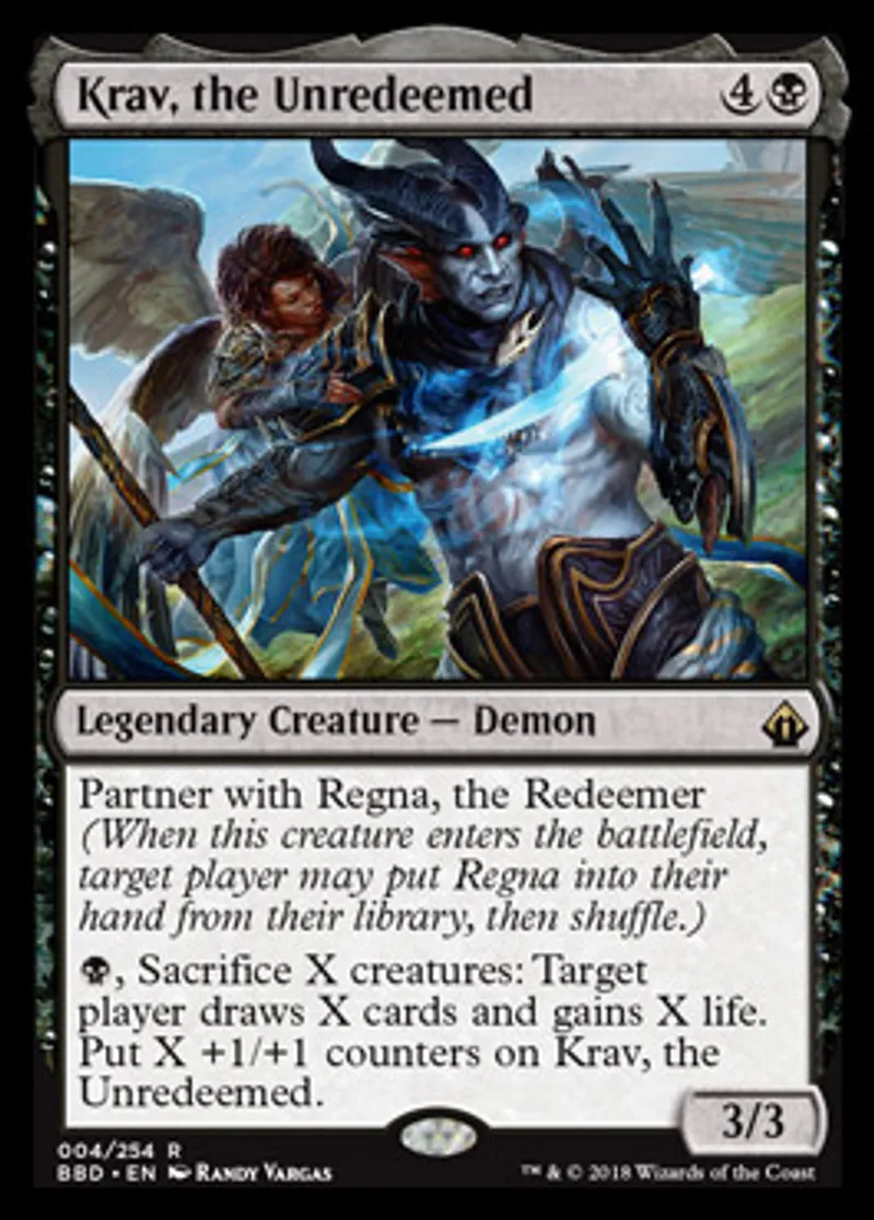 | Oracle Text | Partner with Regna, the Redeemer (When this creature enters the battlefield, target player may put Regna into their hand from their library, then shuffle.) {{b}}, Sacrifice X creatures: Target player draws X cards and gains X life. Put X +1/+1 counters on Krav, the Unredeemed. | ||