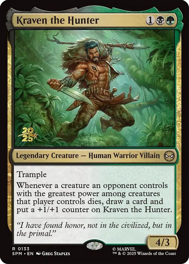 whenever a creature an opponent controls with the greatest power among creatures that player controls dies, draw a card and put a +1/+1 counter on kraven the hunter. | ||