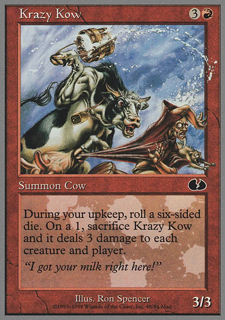 | Oracle Text | During your upkeep, roll a six-sided die. On a 1, sacrifice Krazy Kow and it deals 3 damage to each creature and player. | ||