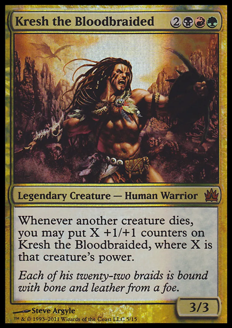 | Oracle Text | Whenever another creature dies, you may put X +1/+1 counters on Kresh the Bloodbraided, where X is that creature's power. | ||