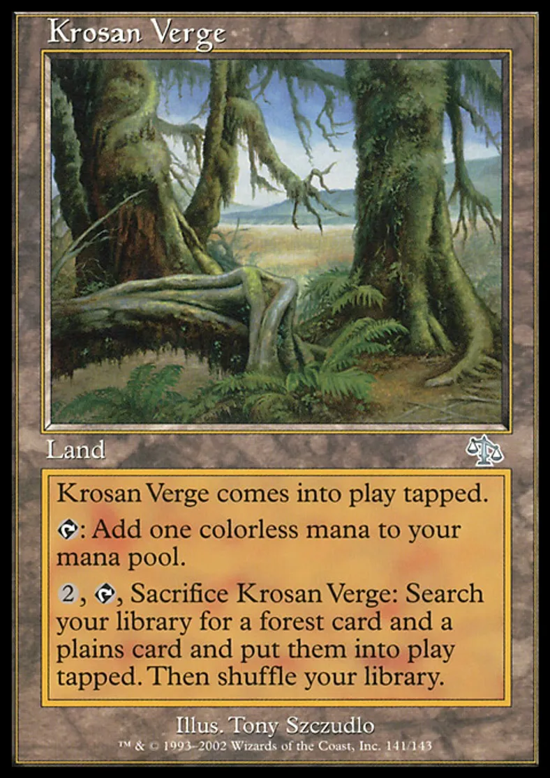 | Oracle Text | Krosan Verge enters the battlefield tapped. {{t}}: Add {{1}} to your mana pool. {{2}}, {{t}}, Sacrifice Krosan Verge: Search your library for a Forest card and a Plains card and put them onto the battlefield tapped. Then shuffle your library. | ||