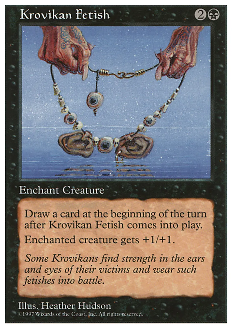 | Oracle Text | Enchant creature When Krovikan Fetish enters the battlefield, draw a card at the beginning of the next turn's upkeep. Enchanted creature gets +1/+1. | ||