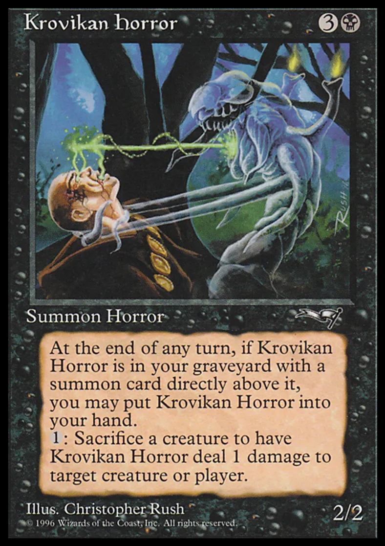| Oracle Text | At the beginning of the end step, if Krovikan Horror is in your graveyard with a creature card directly above it, you may return Krovikan Horror to your hand. {{1}}, Sacrifice a creature: Krovikan Horror deals 1 damage to target creature or player. | ||