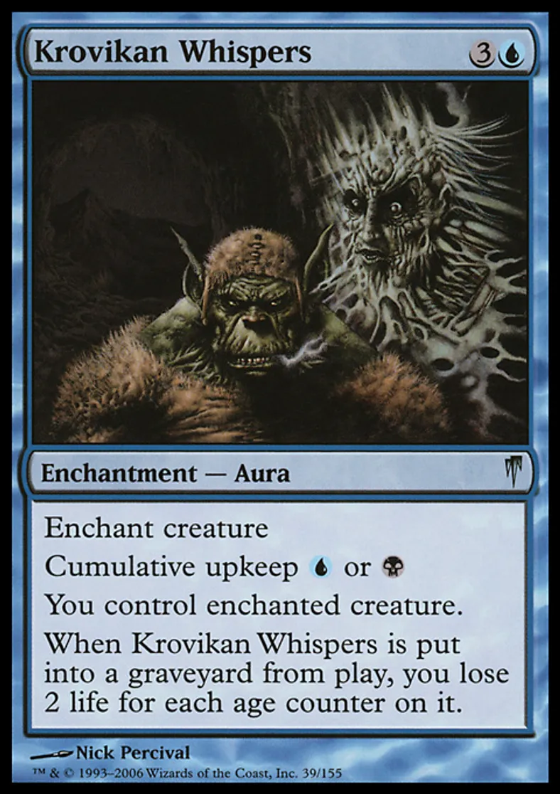 | Oracle Text | Enchant creature Cumulative upkeep {{u}} or {{b}} (At the beginning of your upkeep, put an age counter on this permanent, then sacrifice it unless you pay its upkeep cost for each age counter on it.) You control enchanted creature. When Krovikan Whispers is put into a graveyard from the battlefield, you lose 2 life for each age counter on it. | ||