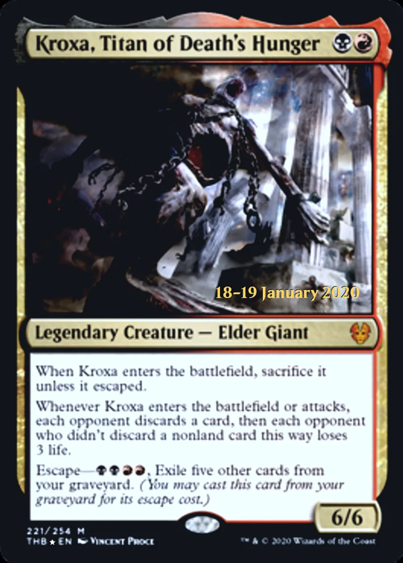 | Oracle Text | When Kroxa enters the battlefield, sacrifice it unless it escaped.\r\nWhenever Kroxa enters the battlefield or attacks, each opponent discards a card, then each opponent who didn\'t discard a nonland card this way loses 3 life.\r\nEscape—{{b}}{{b}}{{r}}{{r}}, Exile five other cards from your graveyard. (You may cast this card from your graveyard for its escape cost.) | ||