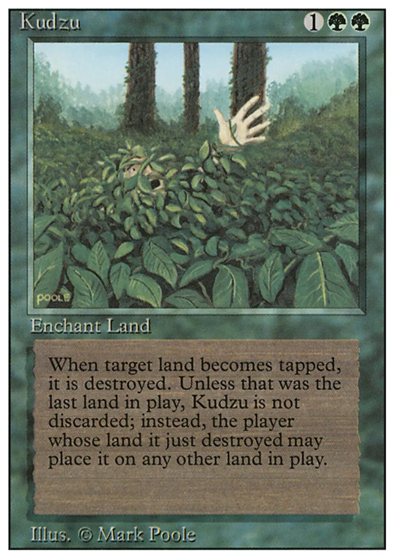 | Oracle Text | Enchant land When enchanted land becomes tapped, destroy it. That land's controller attaches Kudzu to a land of his or her choice. | ||