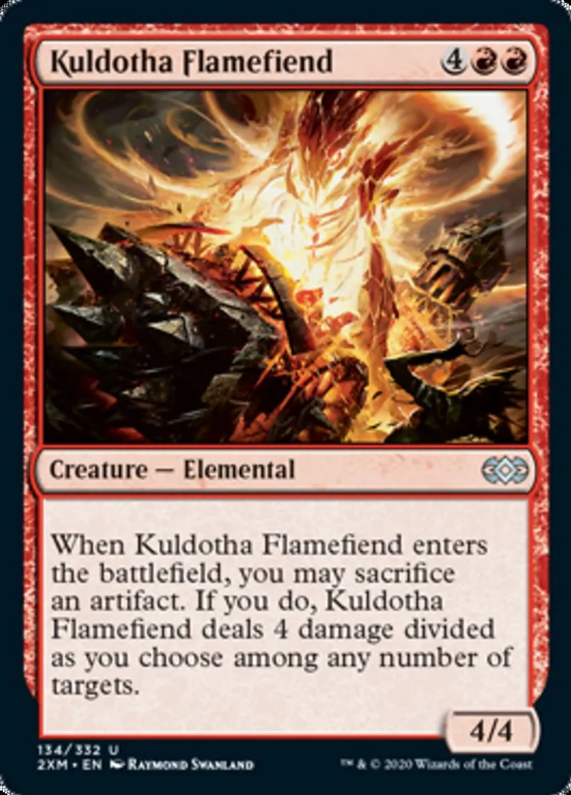 | Oracle Text | When Kuldotha Flamefiend enters the battlefield, you may sacrifice an artifact. If you do, Kuldotha Flamefiend deals 4 damage divided as you choose among any number of targets. | ||