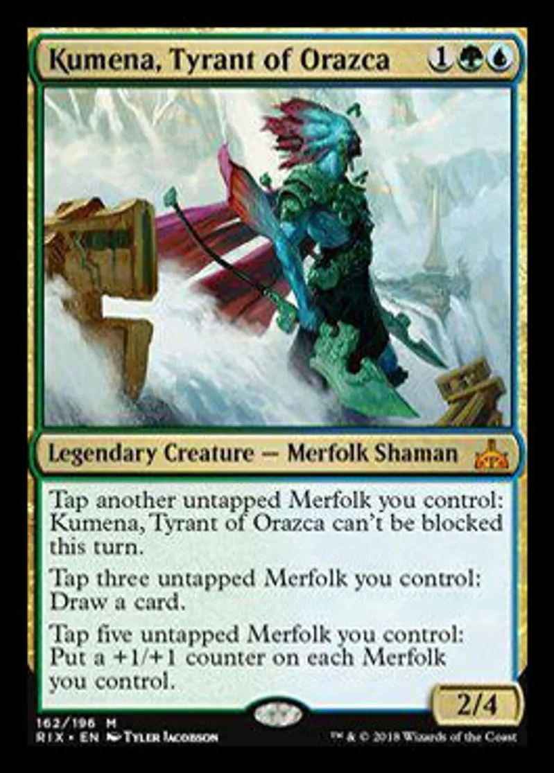 | Oracle Text | Tap another untapped Merfolk you control: Kumena, Tyrant of Orazca can't be blocked this turn. Tap three untapped Merfolk you control: Draw a card. Tap five untapped Merfolk you control: Put a +1/+1 counter on each Merfolk you control. | ||