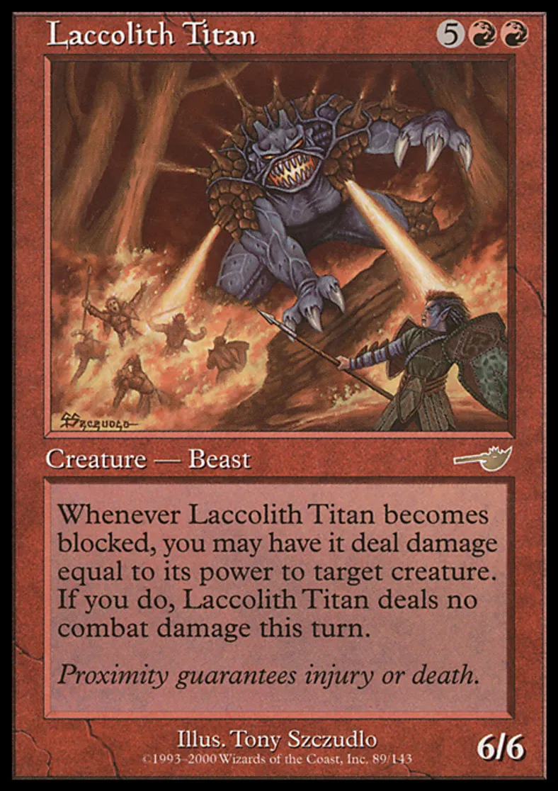 | Oracle Text | Whenever Laccolith Titan becomes blocked, you may have it deal damage equal to its power to target creature. If you do, Laccolith Titan assigns no combat damage this turn. | ||