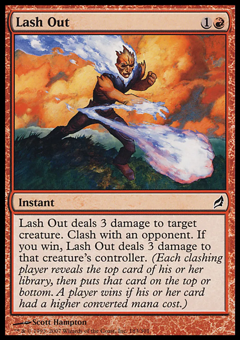 | Oracle Text | Lash Out deals 3 damage to target creature. Clash with an opponent. If you win, Lash Out deals 3 damage to that creature's controller. (Each clashing player reveals the top card of his or her library, then puts that card on the top or bottom. A player wins if his or her card had a higher converted mana cost.) | ||