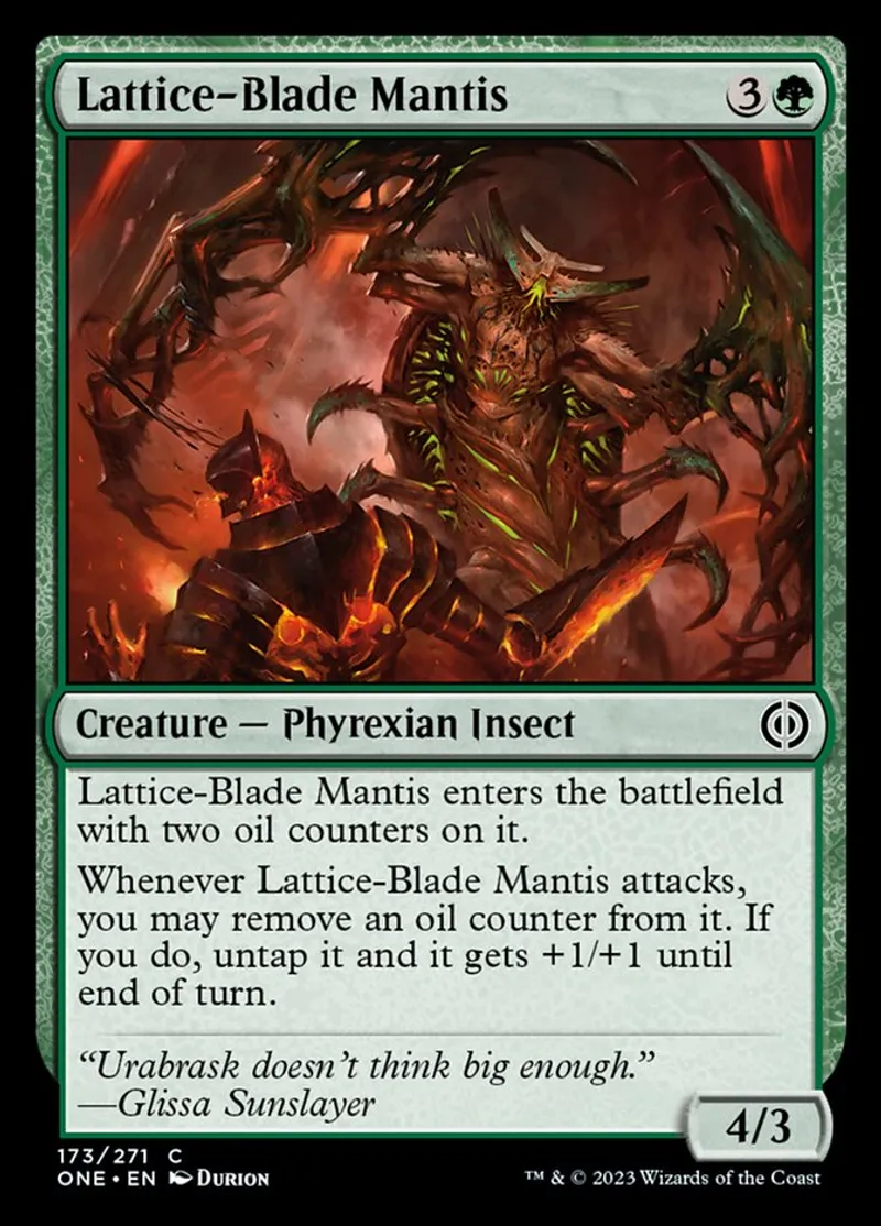 Lattice-Blade Mantis is a common in the set Phyrexia: All Will Be One.