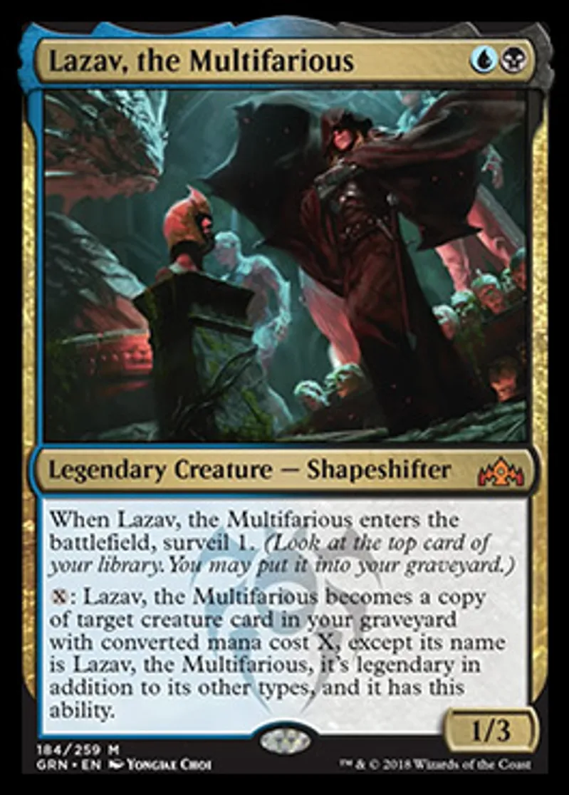 | Oracle Text | When Lazav, the Multifarious enters the battlefield, surveil 1. (Look at the top card of your library. You may put it into your graveyard.) {{x}}: Lazav, the Multifarious becomes a copy of target creature card in your graveyard with converted mana cost X, except its name is Lazav, the Multifarious, it's legendary in addition to its other types, and it has this ability. | ||