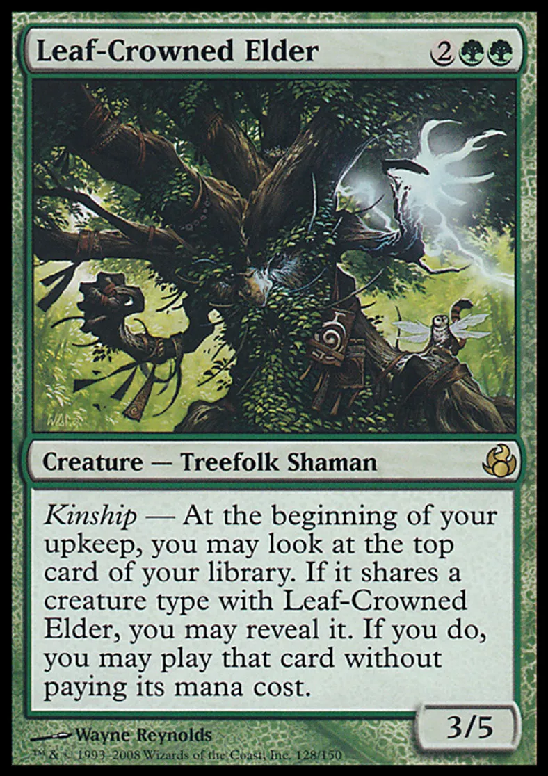 | Oracle Text | Kinship — At the beginning of your upkeep, you may look at the top card of your library. If it shares a creature type with Leaf-Crowned Elder, you may reveal it. If you do, you may play that card without paying its mana cost. | ||