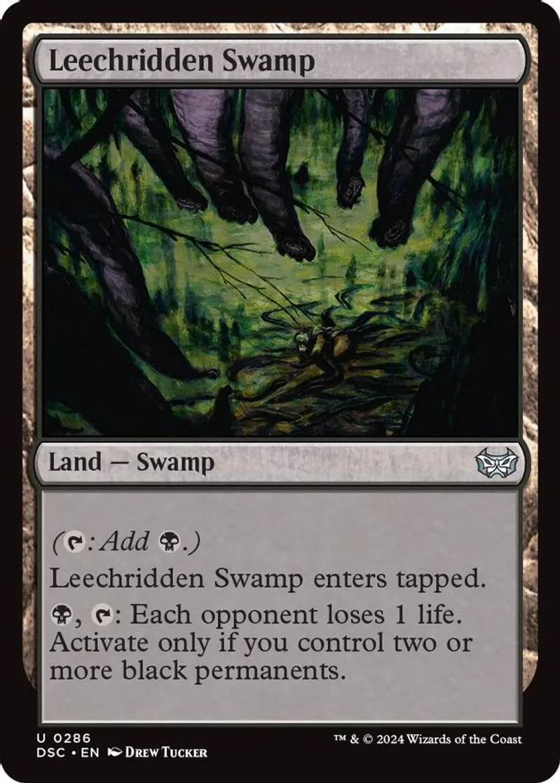 Leechridden Swamp is a Uncommon in the set Commander: Duskmourn: House of Horror.