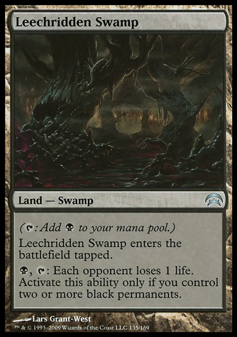 | Oracle Text | ({{t}}: Add {{b}} to your mana pool.) Leechridden Swamp enters the battlefield tapped. {{b}}, {{t}}: Each opponent loses 1 life. Activate this ability only if you control two or more black permanents. | ||