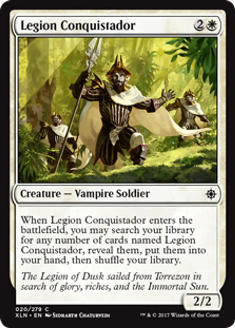| Oracle Text | When Legion Conquistador enters the battlefield, you may search your library for any number of cards named Legion Conquistador, reveal them, put them into your hand, then shuffle your library. | ||