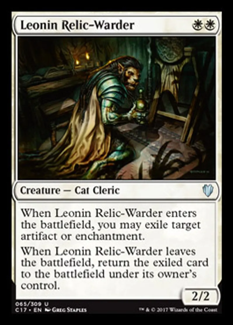 | Oracle Text | When Leonin Relic-Warder enters the battlefield, you may exile target artifact or enchantment. When Leonin Relic-Warder leaves the battlefield, return the exiled card to the battlefield under its owner's control. | ||