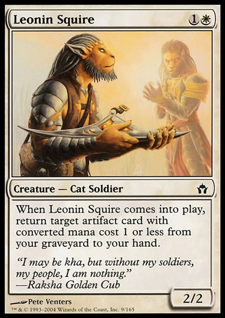 | Oracle Text | When Leonin Squire enters the battlefield, return target artifact card with converted mana cost 1 or less from your graveyard to your hand. | ||