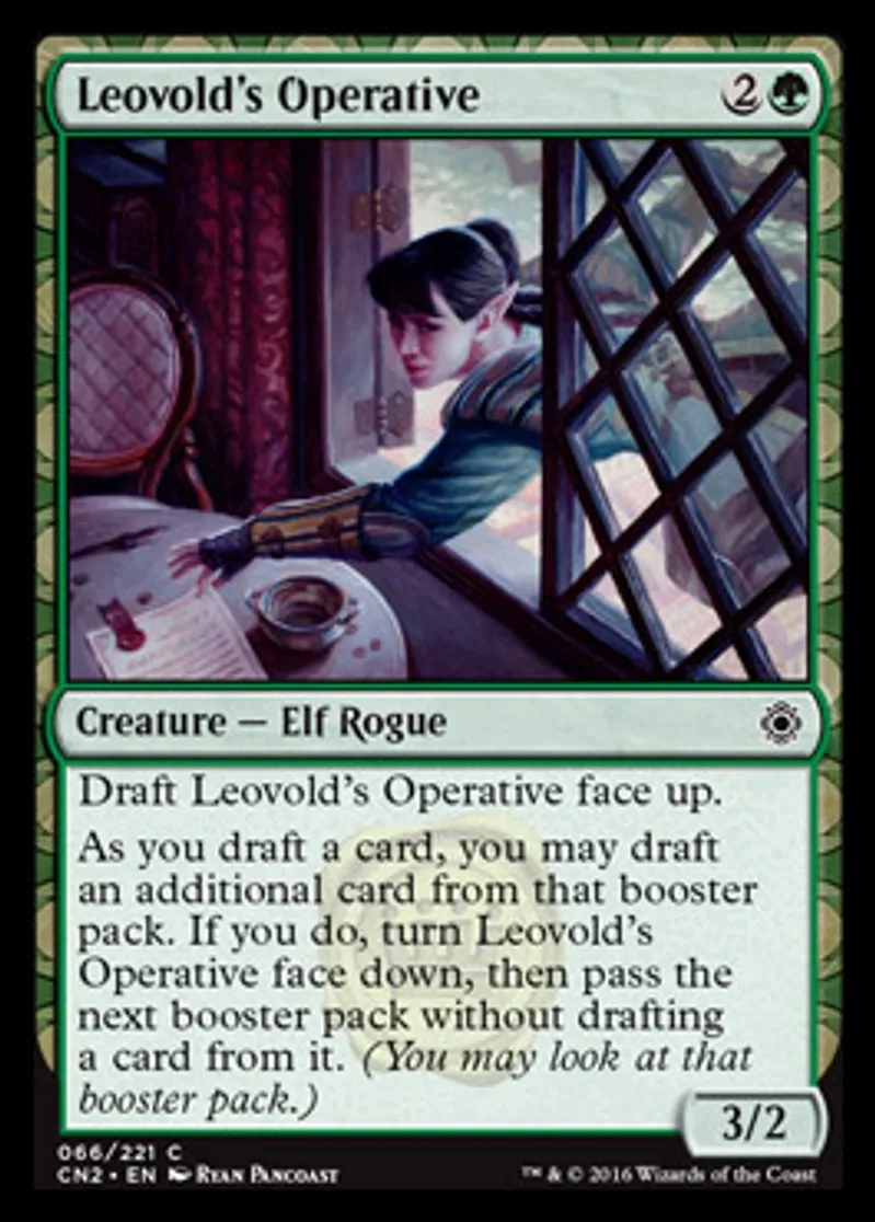 | Oracle Text | Draft Leovold's Operative face up. As you draft a card, you may draft an additional card from that booster pack. If you do, turn Leovold's Operative face down, then pass the next booster pack without drafting a card from it. (You may look at that booster pack.) | ||