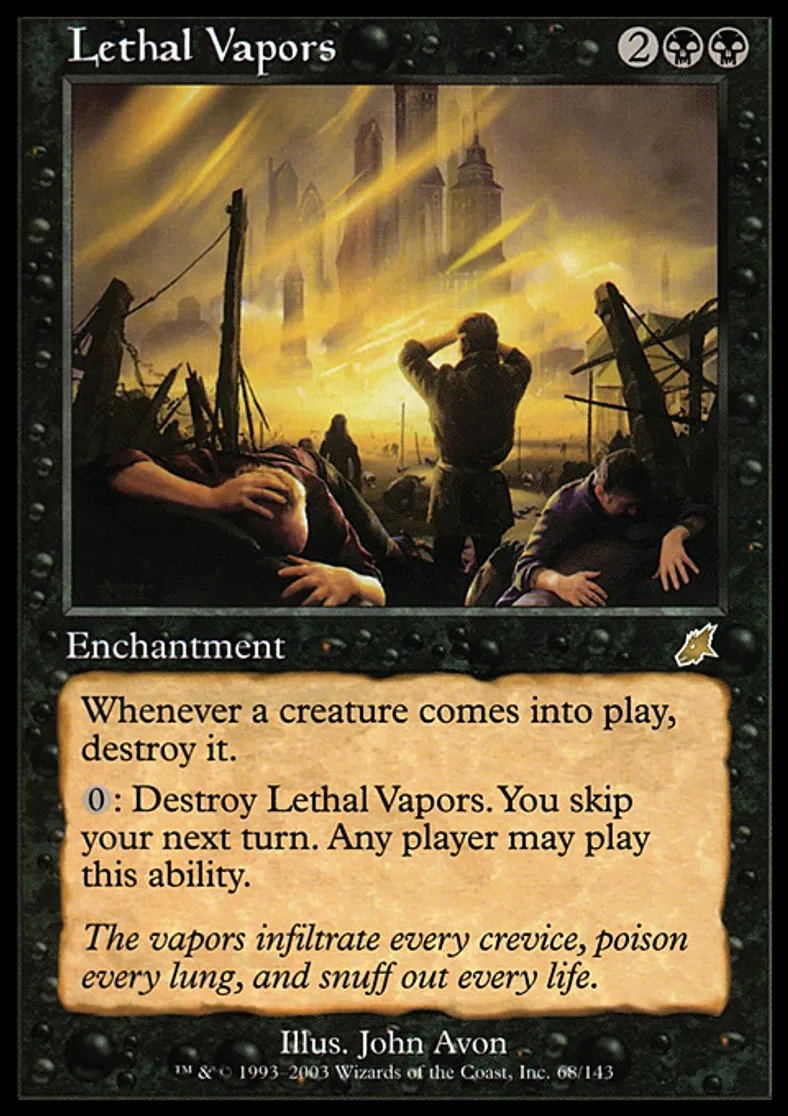 | Oracle Text | Whenever a creature enters the battlefield, destroy it. {{0}}: Destroy Lethal Vapors. You skip your next turn. Any player may activate this ability. | ||