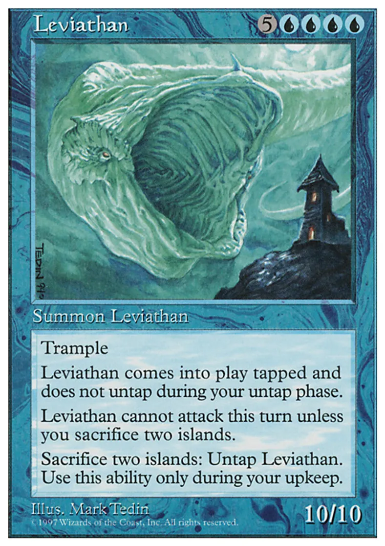 | Oracle Text | Trample Leviathan enters the battlefield tapped and doesn't untap during your untap step. At the beginning of your upkeep, you may sacrifice two Islands. If you do, untap Leviathan. Leviathan can't attack unless you sacrifice two Islands. | ||