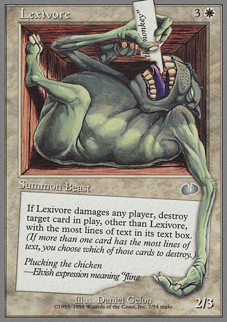 | Oracle Text | If Lexivore damages any player, destroy target card in play, other than Lexivore, with the most lines of text in its text box. (If more than one card has the most lines of text, you choose which of those cards to destroy.) | ||