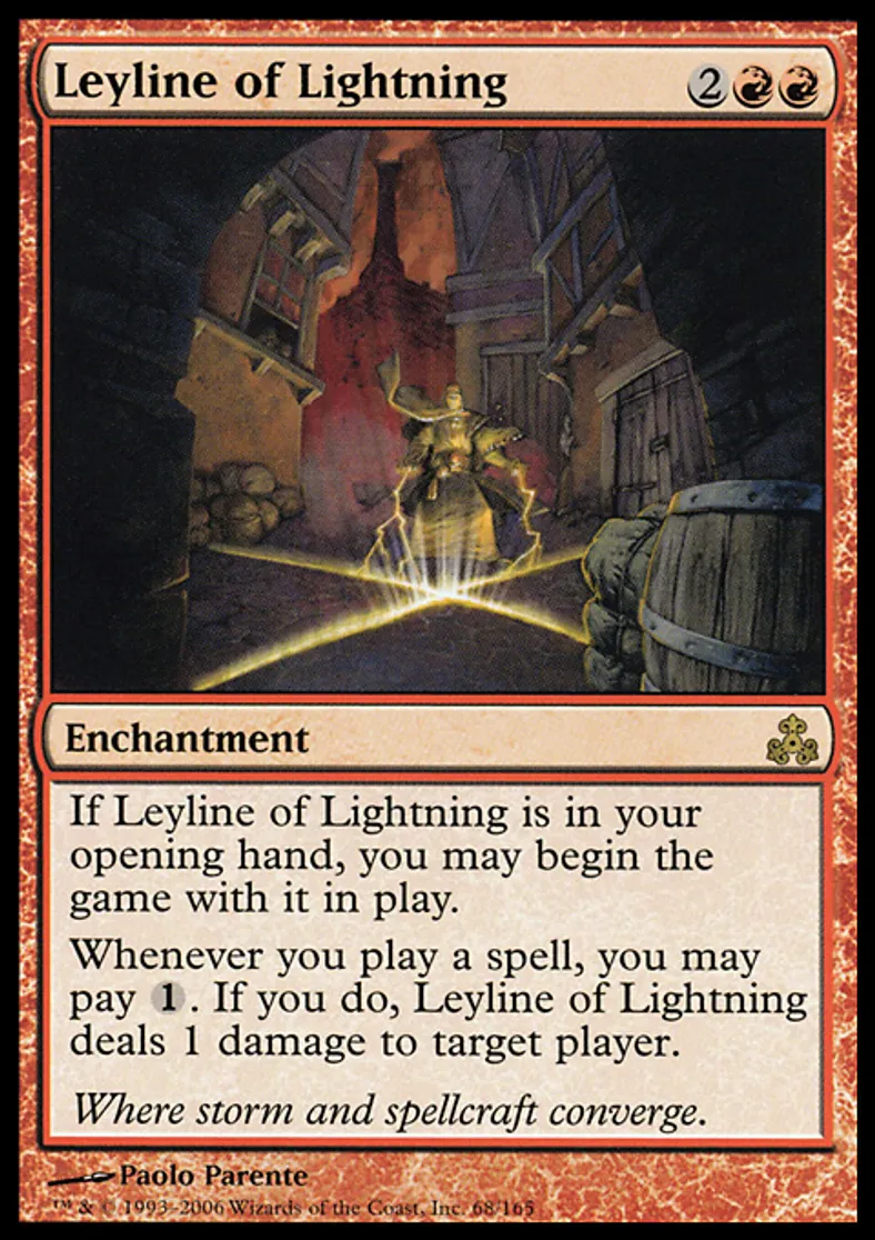 | Oracle Text | If Leyline of Lightning is in your opening hand, you may begin the game with it on the battlefield. Whenever you cast a spell, you may pay {{1}}. If you do, Leyline of Lightning deals 1 damage to target player. | ||