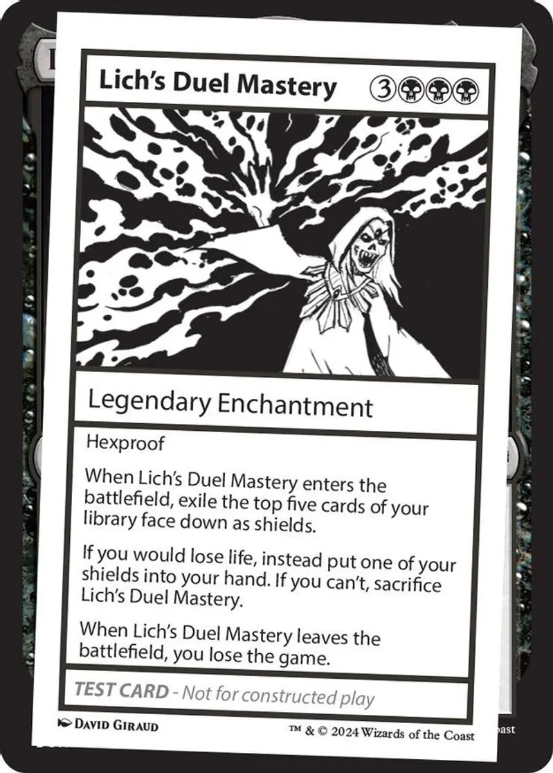 | Oracle Text | hexproof when lich's duel master enters the battlefield, exile the top five cards of your library face down as shields. if you would lose life, instead put one of your shields into your hand. if you can't, sacrifice lich's duel mastery. when lich's duel mastery leaves the battlefield, you lose the game. | ||