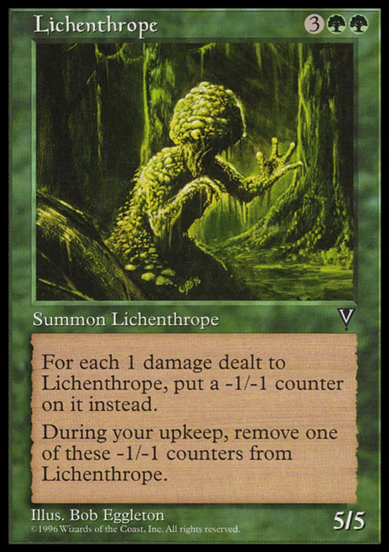 | Oracle Text | If damage would be dealt to Lichenthrope, put that many -1/-1 counters on it instead. At the beginning of your upkeep, remove a -1/-1 counter from Lichenthrope. | ||