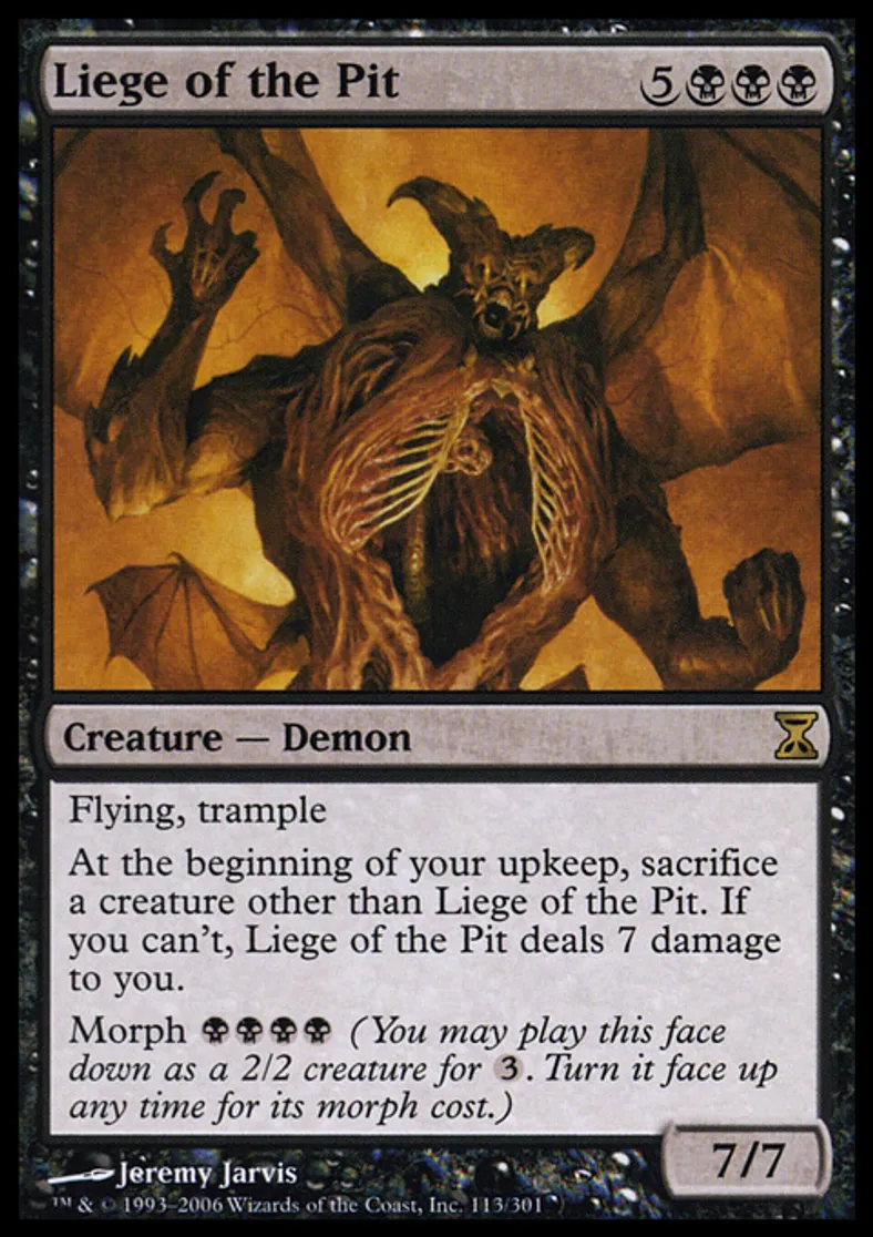 | Oracle Text | Flying, trample At the beginning of your upkeep, sacrifice a creature other than Liege of the Pit. If you can't, Liege of the Pit deals 7 damage to you. Morph {{b}}{{b}}{{b}}{{b}} (You may cast this face down as a 2/2 creature for {{3}}. Turn it face up any time for its morph cost.) | ||